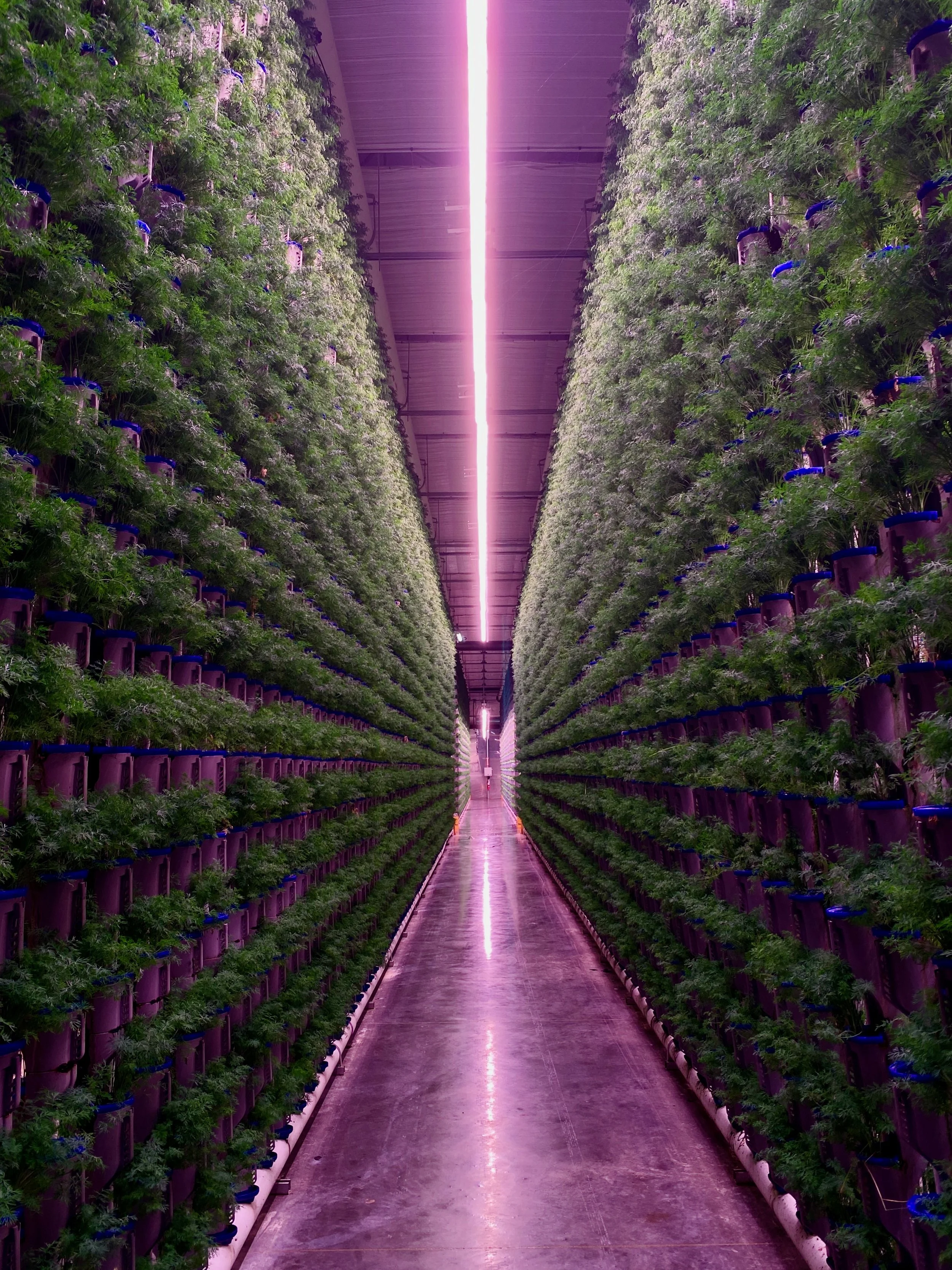 In 2022, Eden Green opened its two-acre farm in Cleburne, about thirty miles south of Fort Worth. The company has been around since 2017 but focused on research and development before opening the facility. Its growing space is a hybrid between a greenhouse and typical vertical farms, combining the ability to take advantage of sunlight with the density of stacked crops. Lettuce and herb plants there sprout in cup holder-sized pods on towers that extend eighteen feet high. Eden Green has successfully cultivated more than two hundred varieties of crops but has no plans to grow anything besides lettuce and herbs commercially. A clear plastic roof overhead lets in direct sunlight for each of the facility’s 320,000 plants. The company estimates using 4.59 kilowatt hours per pound of lettuce, bringing its energy use closer to the average greenhouse than to other vertical farms.